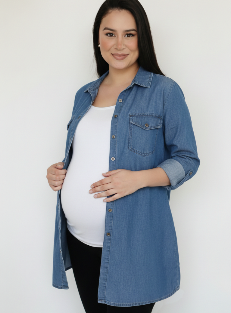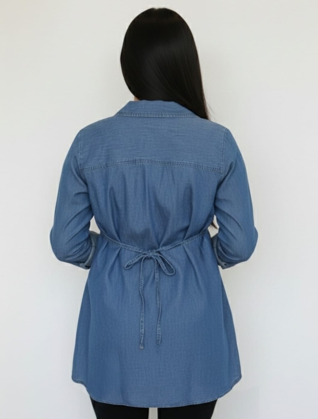 Blusa camisera Jean con proceso de lavado, bolsillos delanteros, manga 3/4 con charretera, cordon en la espalda, elaborado en tela indigo jean liviano.