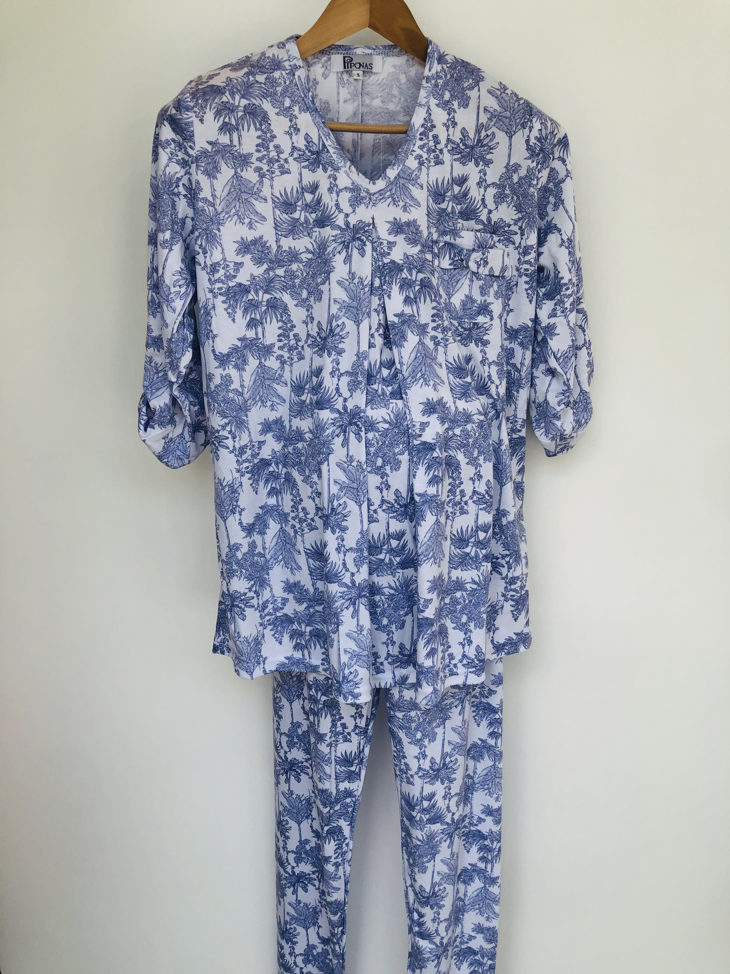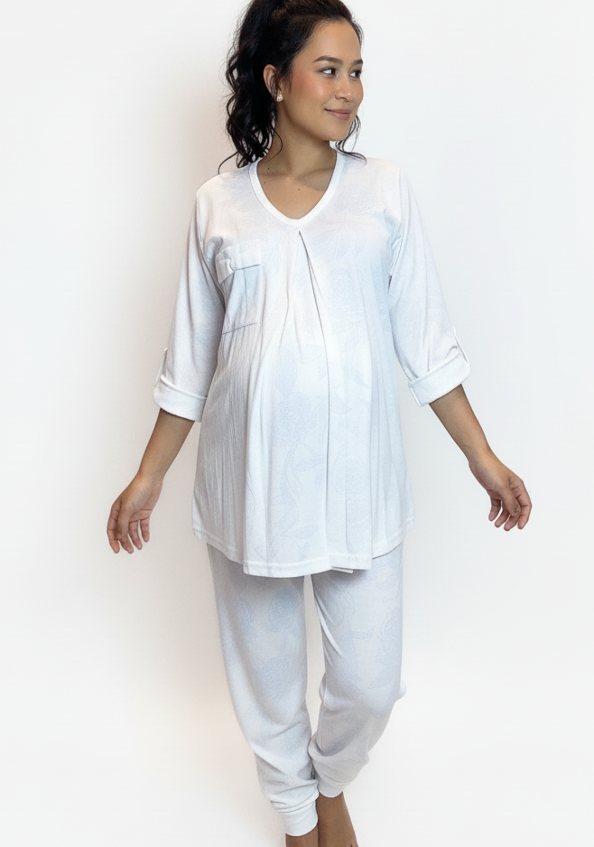 Pijama  estampada  con camiseta en cuello redondo manga ¾ con charretera,  con abertura adelante para lactancia y pantalón bota recta, elaborado en tela algodón poliéster con spandex